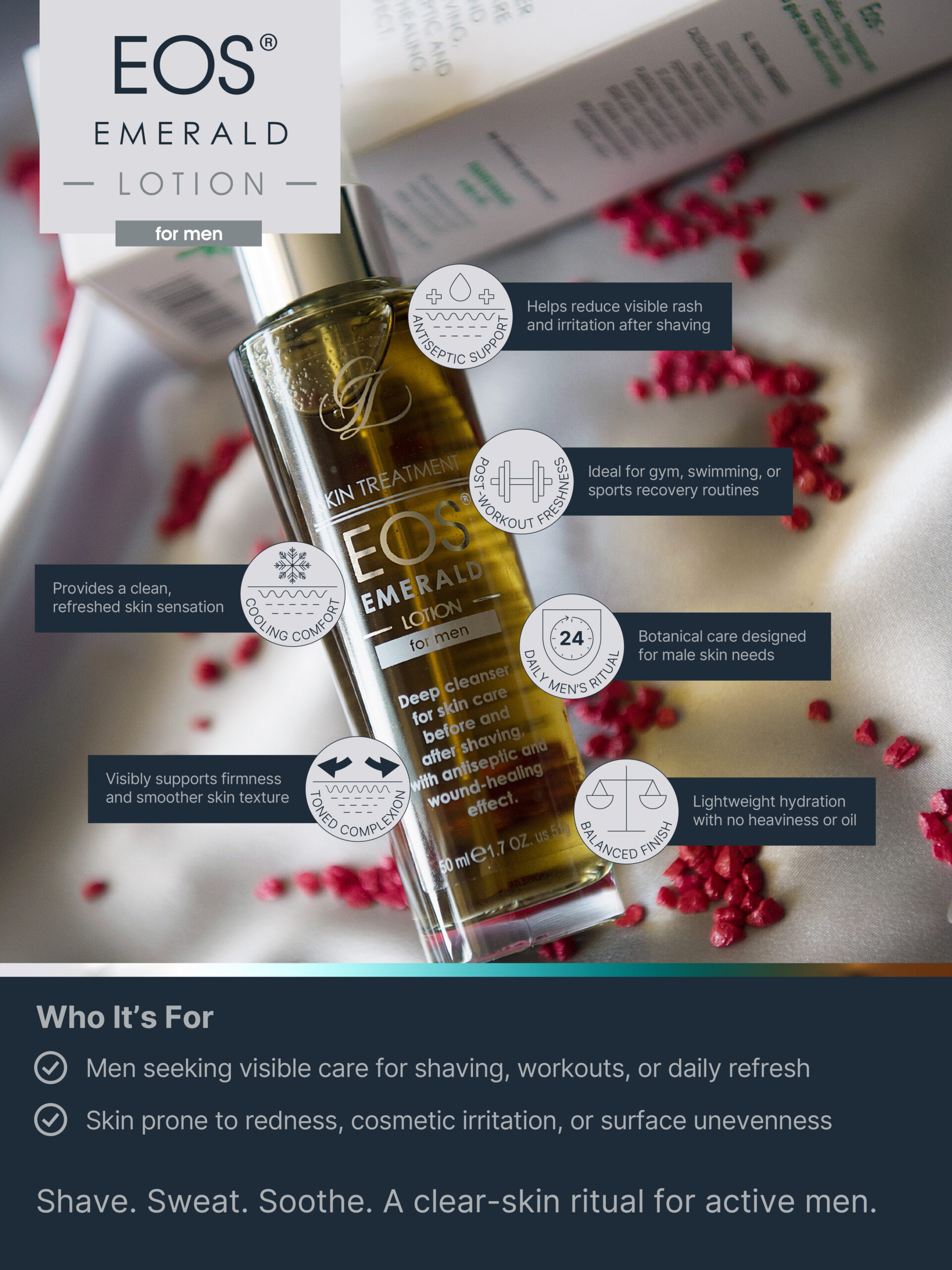This antiseptic lotion helps calm the skin after shaving, workouts, or heat exposure—targeting rash, cosmetic inflammation, and uneven texture. Refreshes and firms without oil or residue. A clean, weightless finish for active male skin.