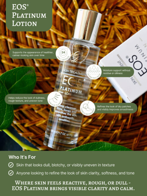 This advanced botanical lotion is designed for areas of the skin that show visible signs of dryness, irritation, or environmental stress. Whether your skin feels rough, looks patchy, or lacks vibrancy, EOS Platinum helps restore the appearance of smoothness, clarity, and comfort.